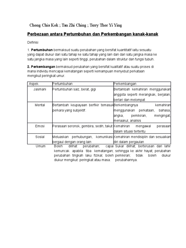 Perbezaan antara perkembangan dan pertumbuhan kanak kanak. Biasanya beberapa orang sering bercakap seperti tumbuhan itu akhirnya mengalami pertumbuhan yang cepat binatang yang aku pelihara telah berkembang biak dan sebagainya. Kanak kanak awal dari usia bayi sehingga umur 6 tahun sementara kanak kanak pertengahan dan akhir di antara lingkungan umur 7 tahun sehingga 12 tahun. Menurut buku perkembangan kanak kanak nukilan haliza hamzah joy n. Perbezaan antara pertumbuhan dan perkembangan kanak kanak definisi 1.