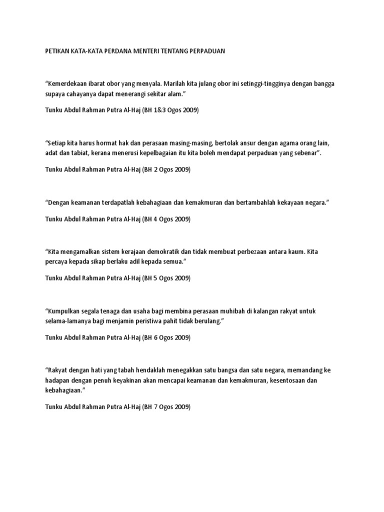 Petikan kata kata tunku abdul rahman. Tidak ada isme yang boleh diimport dari luar negeri. Perpaduan kaum merupakan asas utama yang mendasari perjuangan dan pentadbiran perdana menteri pertama tunku abdul rahman putra al haj kata ahli parlimen gua musang tengku razaleigh hamzah. Setiap perdana menteri ini mempunyai kelebihan yang tersendiri terutamanya dalam aspek menjalin hubungan diplomatic dengan negara luar. Pemimpin yang telah banyak memberikan jasa dan pengorbanan yang cukup besar di atas bumu malaysia.