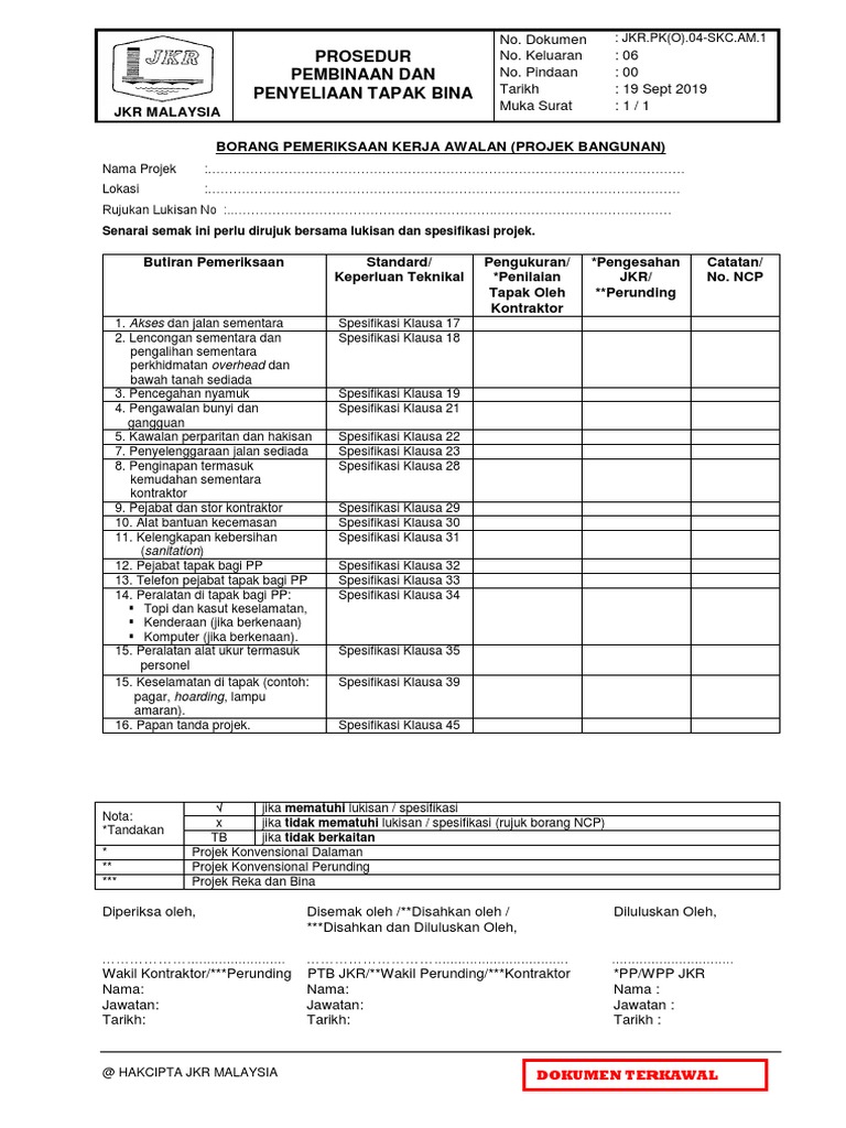 1 1 borang pemeriksaan kerja kerja awalan kontrak elektrik. Kedudukan dan keluasan tapak bina bentuk muka bumi infrastruktur dan kemudahan awam sedia ada mengukur tapak berdasarkan peta topo dan peta geologi kedudukan lokasi tapak bina dan batu sempadan ditentukan.