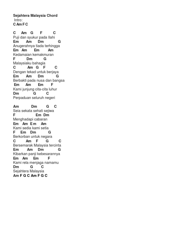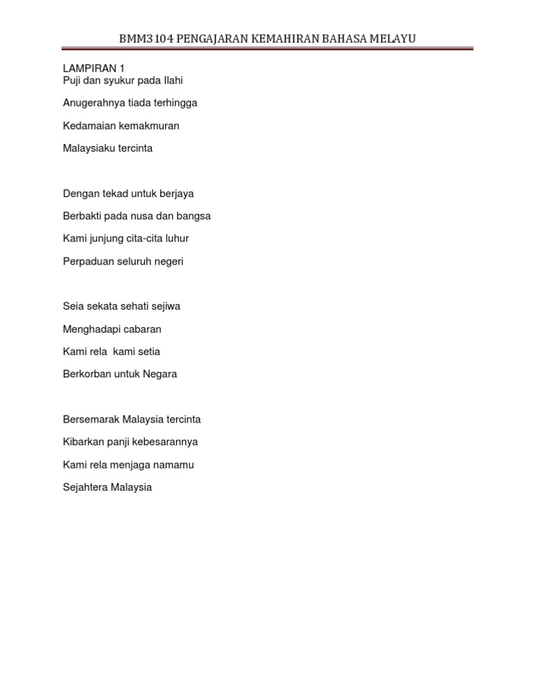 Hai umat sluruh dunia. Puji dan syukur pada ilahi anugerahnya tiada terhingga kedamaian kemakmuran malaysiaku bahagia dengan tekad untuk berjaya berbakti pada nusa dan bangsa kami junjung cita cita luhur perpaduan seluruh negeri korus seia sekata sehati sejiwa menghadapi cabaran kami sedia kami setia berkorban untuk negara. Puji dan syukur pada ilahi anugerahnya tiada terhingga kedamaian kemakmuran malaysiaku bahagia dengan tekad untuk berjaya berbakti pada nusa dan bangsa kami junjung cita cita luhur perpaduan seluruh negeri chorus seia sekata sehati sejiwa menghadapi cabaran kami setia kami sedia berkorban untuk negara bersemarak malaysia tercinta kibarkan panji kebesarannya kami rela menjaga namamu sejahtera. Sejahtera malaysia puji dan syukur pada ilahi anugerahnya tiada terhingga kedamaian kemakmuran malaysiaku bahagia.