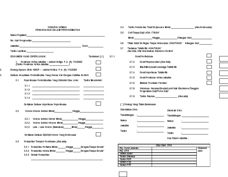 Nama jawatan tarikh tandatangan. Pengesahan dalam perkhidmatan dilaksanakan berdasarkan peraturan 29 peraturan peraturan pegawai awam pelantikan kenaikan pangkat dan penamatan perkhidmatan 2012 p u. Senarai semak pemberian taraf berpencen 2. Salinan kenyataan perkhidmatan yang kemas kini dengan catatan berikut 2 1 2 2 2 3 tarikh pengesahan pelantikan tarikh pengesahan dalam perkhidmatan 1 catatan opsyen pencen disediakan oleh.