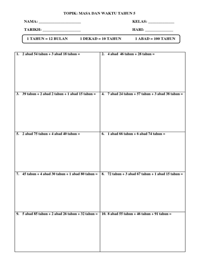 Soalan matematik masa dan waktu tahun 5. Koleksi soalan dan latihan matematik tahun 5 jawapan. Soalan latih tubi matematik tahun 5 ini adalah himpunan soalan soalan yang telah disumbangkan oleh beberapa guru matematik di seluruh malaysia semoga bermanfaat. Klon soalan upsr yang sangat berguna untuk pelajar tahun 6. Melalui penggunaan ict para guru boleh memaksimumkan penambahan perkongsian pembelajaran secara online sama ada pembelajaran secara jarak jauh atau pembelajaran kendiri tanpa mengambil kira lokasi dan tahap.