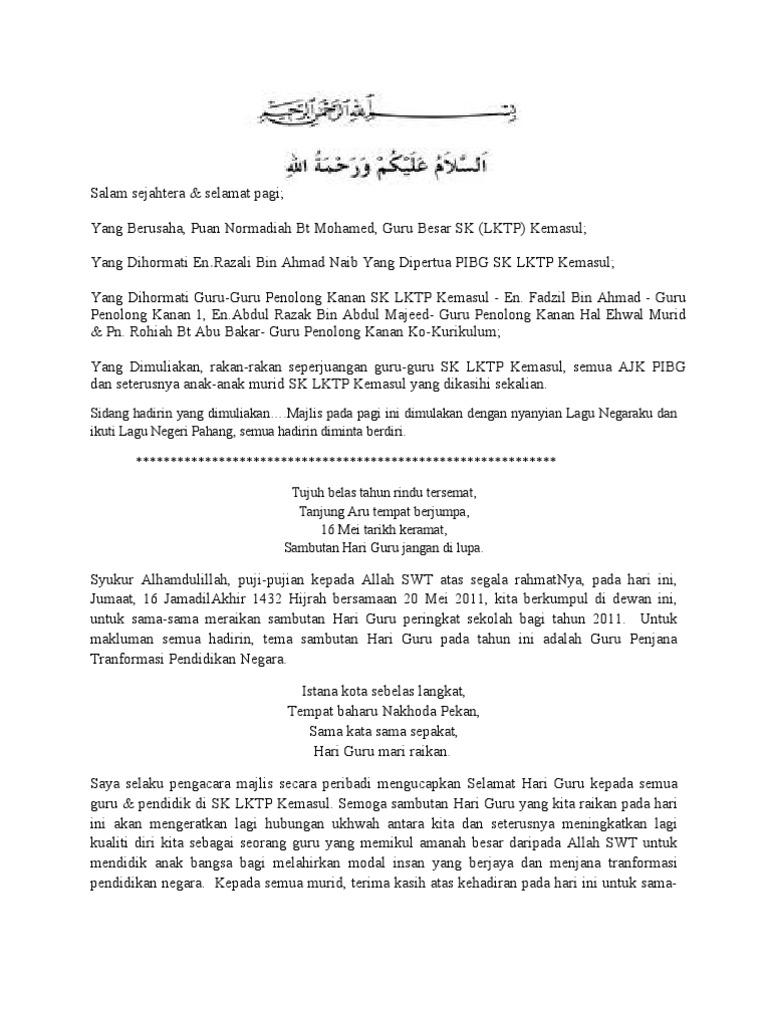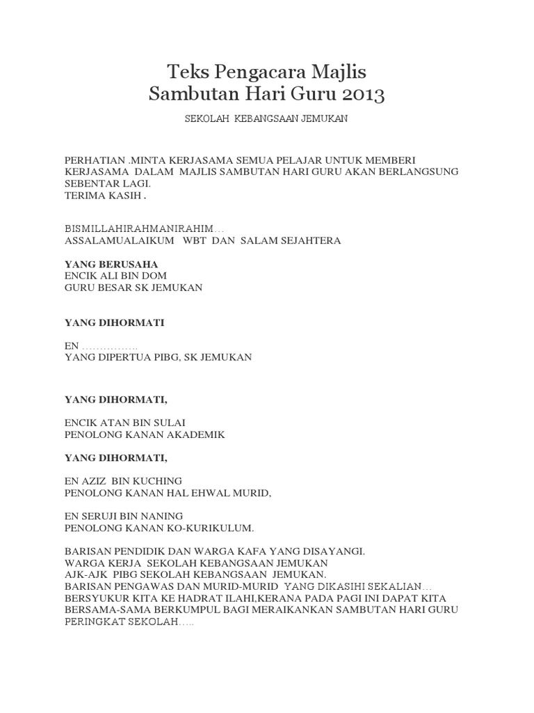2 alhamdulillah marilah kita sama sama memanjatkan syukur ke hadrat ilahi kerana dengan limpah kurnianya jua maka kita diberikan luangan waktu dan kesempatan untuk kita sama sama berkumpul di dewan gemilang ini bagi meraikan sambutan hari guru peringkat. Antara tugas yang penting pada hari guru adalah pengacara majlis hari guru mc atau pengacara majlis mungkin sudah hebat dalam mengacara majlis namun tidak semua mempunyai kepakaran dalam bidang ini. Mendengar pungguk berlagu merdu selamat hari guru kita ucapkan kerana jasa menaburkan ilmu majlis diteruskan dengan segala hormatnya mempersilakan encik adenan bin mustapha bagi menyampaikan ucapan wakil guru sesi pagi sempena perayaan hari guru dan pekerja peringkat sekolah. Yang berusaha puan normala guru besar sk gedok guru guru penolong kanan guru guru penolong kanan guru guru dan murid murid sekalian.