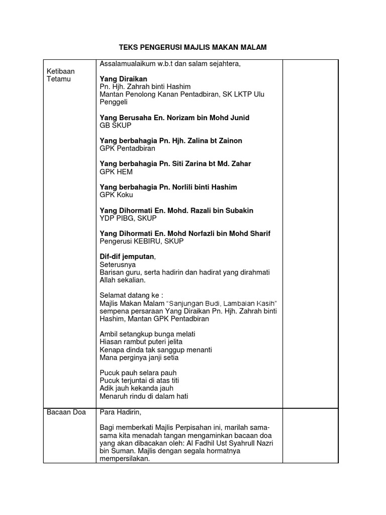 Mengumumkan ketibaan yang diraikan en. Ke hadrat llahi kerana dengan kurnia nya dapat kita berkumpul di dewan budiman pada pagi yang ceria untuk menjayakan majlis perpisahan pk hem pn mariatul kabtiah binti jamil dan majlis persaraan kaunselor smk hulu kelang. Contoh ucapan pengacara majlis mc bagi majlis makan malam tips tips untuk mengacara majlis. Aku biasa juga membuat teks pengacara majlis untuk majlismajlis jabatan aku.
