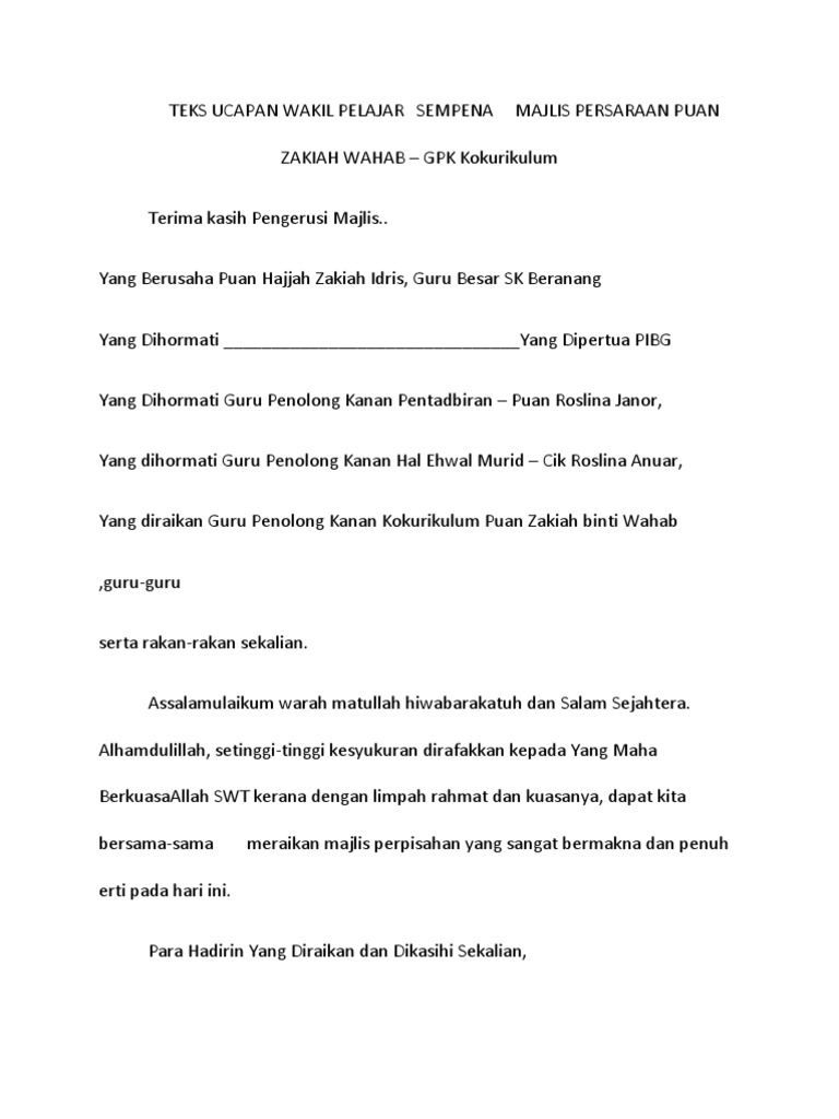 Teks ucapan persaraan guru oleh ketua murid. Selamat datang ke majlis kasih disemai bakti dituai sempena persaraan cikgu nama guru dirai. Sirih berlipat sirih pinang. Teks ucapan wakil pelajar sempena majlis persaraan puan janatu sapuan terima kasih kepada puan pengerusi majlis. Guru guru seterusnya murid murid hadirin dan hadirat yang dirahmati allah sekalian.
