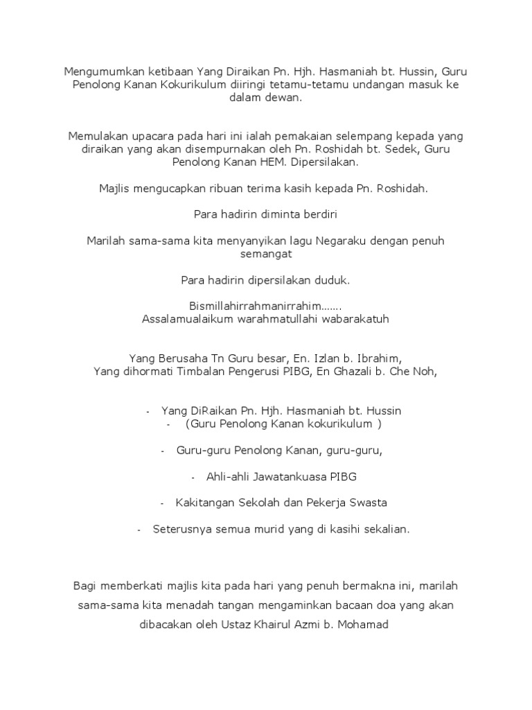 31 mac 2016 khamis terima kasih pengacara majlis. Yang dihormati guru guru penolong kanan ketua ketua bidang barisan. Mengumumkan ketibaan yang berbahagia tn hj mad aris bin azis. Bismillahirrahmaniraahim assalamualaikum w b t dan salam sejahtera semua.