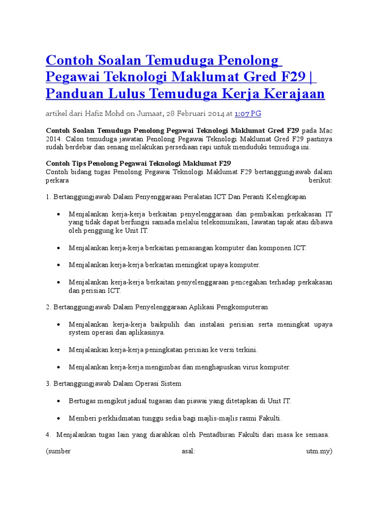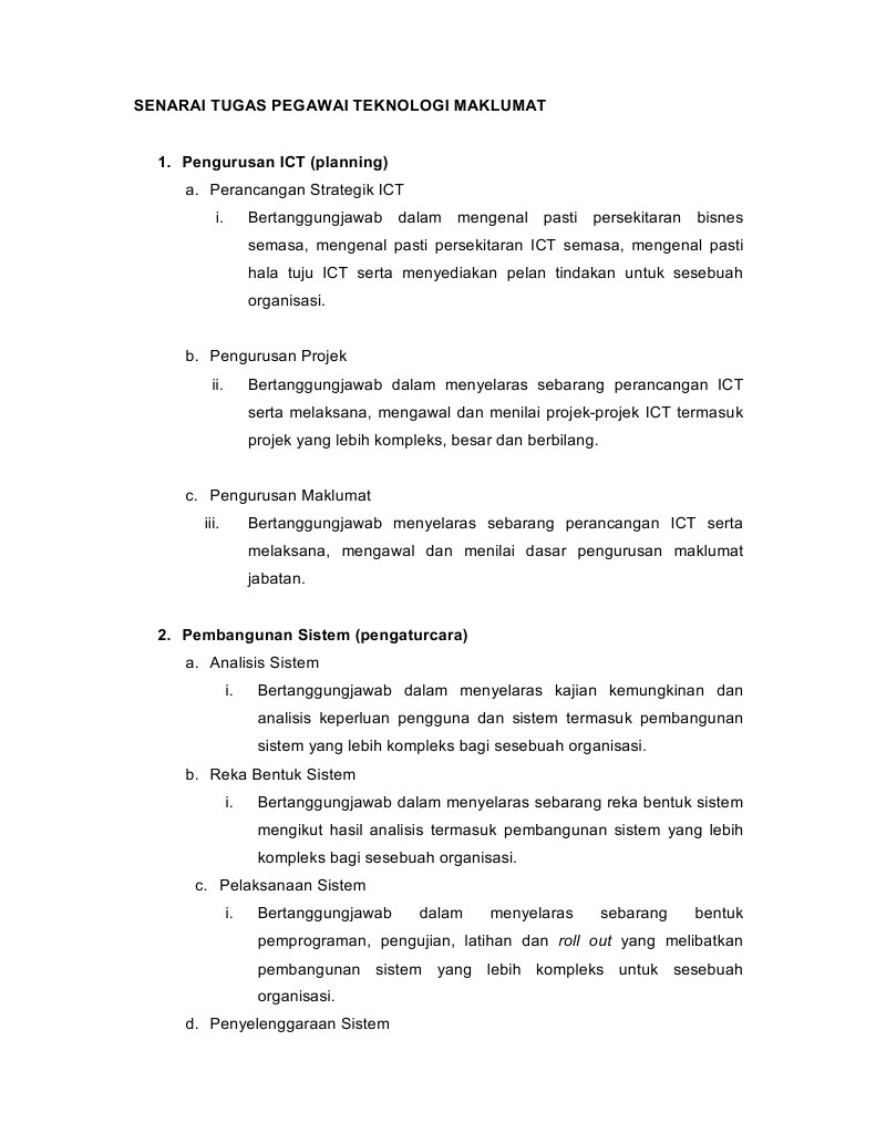 Setelah dua tahun menjawat jawatan di kpm maka kini saya berhasrat mahu berkongsi sedikit sebanyak maklumat berkaitan bidang pegawai teknologi maklumat di jabatan kerajaan. Skop dan tugas pegawai teknologi maklumat ptm posted by marini azahri at 4 58 am labels. Berikut merupakan deskripsi tugas penolong pegawai teknologi maklumat gred fa29 buat panduan dan rujukan pemohon jawatan kosong ini. Bertanggungjawab mengkaji dan menganalisis kemungkinan kesesuaian sistem komputer yang sedia ada dan seterusnya mereka bentuk membangun melaksana menyelenggara serta kajian semula sistem pemprosesan data dan maklumat.