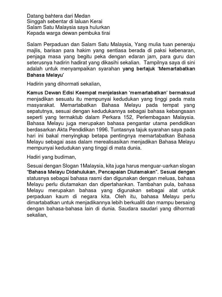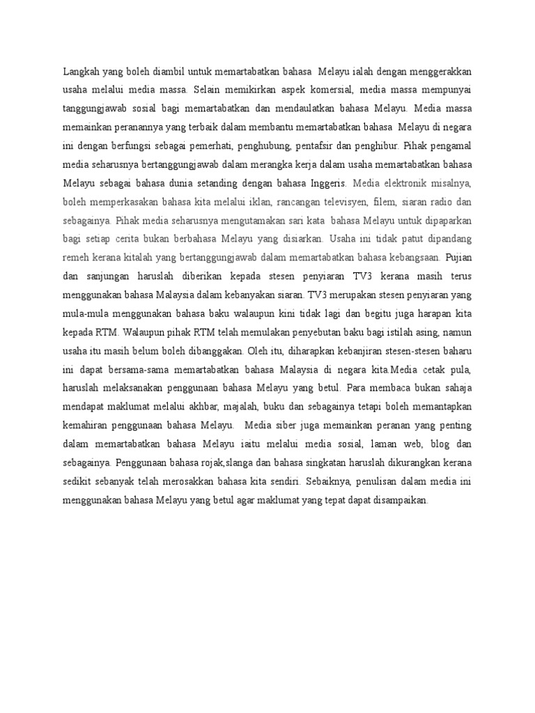 Tersendiri dalam perkembangan bahasa melayu pada zaman pramerdeka ini. Bahasa sebagai salah satu tonggak tamadun bangsa atau jati diri bangsa tidak boleh tercicir atau tersisih bahkan mesti diperkukuh dan diperluas peranannya. Bahasa melayu akan terus menghadapi cabaran dalam memenuhi peranannya sebagai wahana kebudayaan moden. Variasi tema dan tajuk yang berpotensi menjadi soalan karangan dalam kertas peperiksaan bahasa melayu sebagai pelajar anda perlu bersikap proaktif dan rajin dalam mencari contoh contoh karangan yang menggunakan pelbagai jenis tema sebelum menduduki peperiksaan berikut dikongsikan contoh karangan langkah langkah memartabatkan bahasa malaysia untuk rujukan semua.